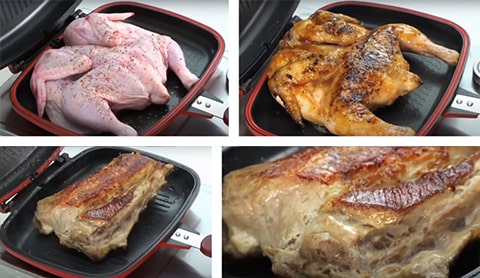 На більш рівній стороні зручно готувати такі страви як пасти, запіканки, омлети, котлети, відбивні та доводити їх до готовності з обох боків, не переживаючи про запах і копоту, а також розбризкування масла.